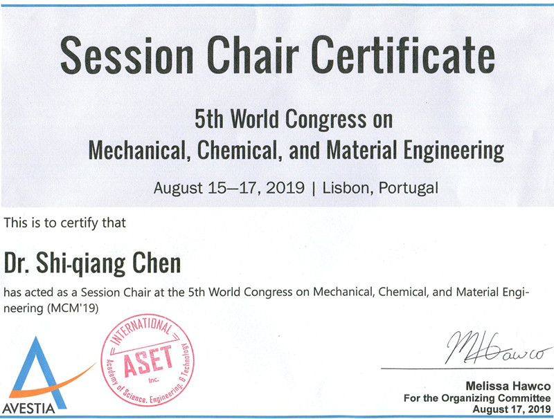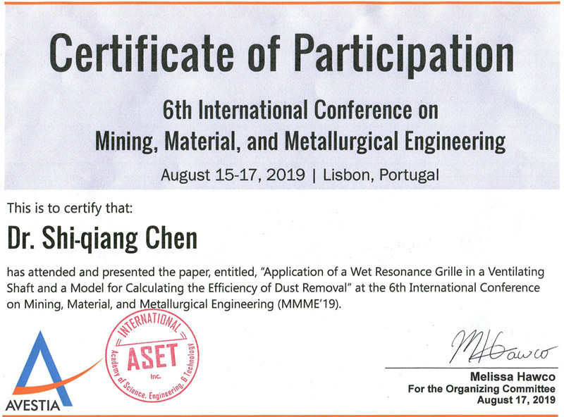 2019年8月15日至20日,王海桥教授、陈世强副教授参加了在葡萄牙里斯本召开的5th International Conference On Mining, Material, and Metallurgical Engineering(MMME2019)学术会议。